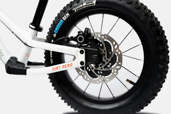 The Dirt Hero off-road balance bike is a scaled down enduro machine, designed specifically for MTB kids who want to take to the trails. Off-road pneumatic tires, 12-14” convertibility, mtb geometry and a rear hydraulic disc brake inspires confidence and progression in mini mountain bikers who want to get off the driveway and onto the dirt.